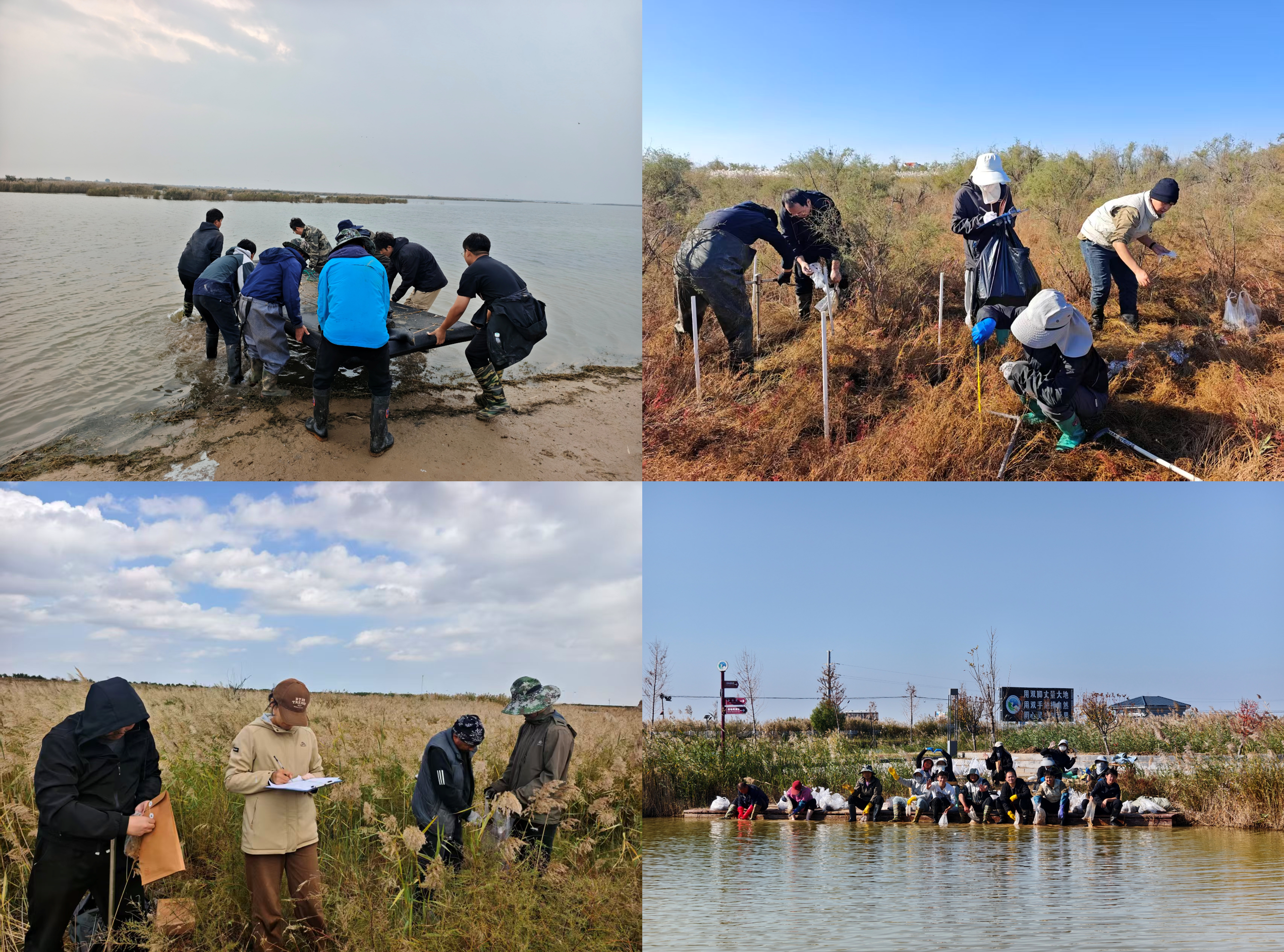 考察采取海陆协同推进方式,系统开展了陆域植被-土壤“综合体检”、生态修复示范区“跟踪复诊”、不同修复年限湿地“梯度回头看”以及固定样地“年度基准复测”等工作。时值深秋,霜重盐白,风寒水冷,全体队员不畏艰苦,在泥泞中跋涉、于冰水中采样,将团队凝聚力淬炼于寒风之中,把科研战斗力铸就在泥滩之上。历经7天连续奋战,圆满完成了对黄河三角洲区域植被、土壤、水质、底栖生物及景观格局的逐项精准调查。